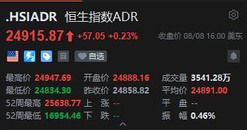 智通财经APP获悉,周五美股三大指数齐涨,恒生指数ADR上涨,按比例计算,收报24915.87点,较香港收市涨57.05点或0.23%。