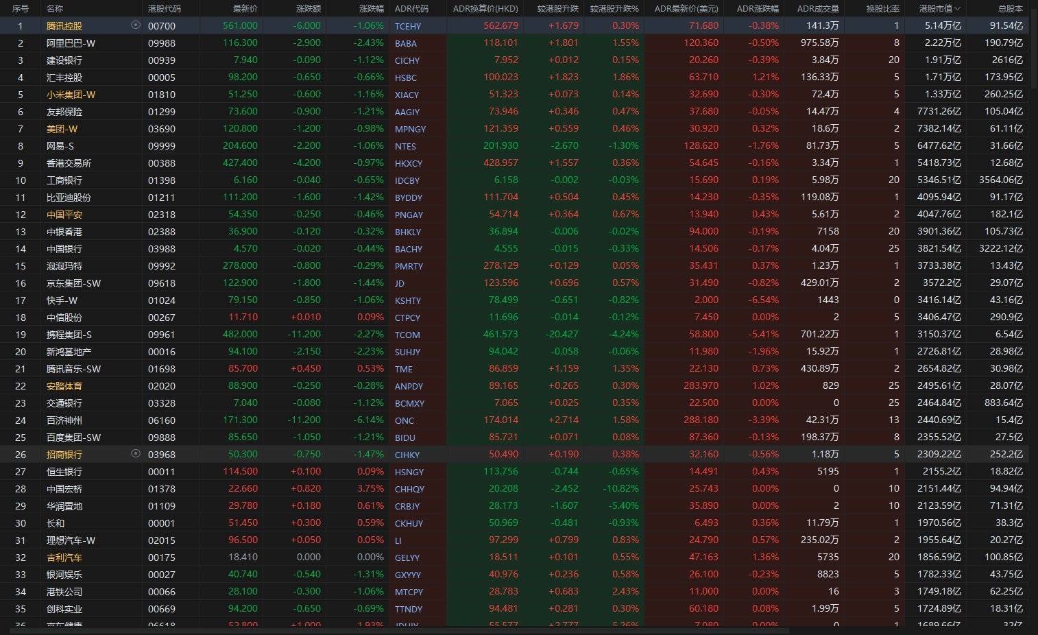 大型蓝筹股多数上涨,汇丰控股收报100.023港元,较香港收市涨1.86%;腾讯控股收报562.679港元,较香港收市涨0.30%。